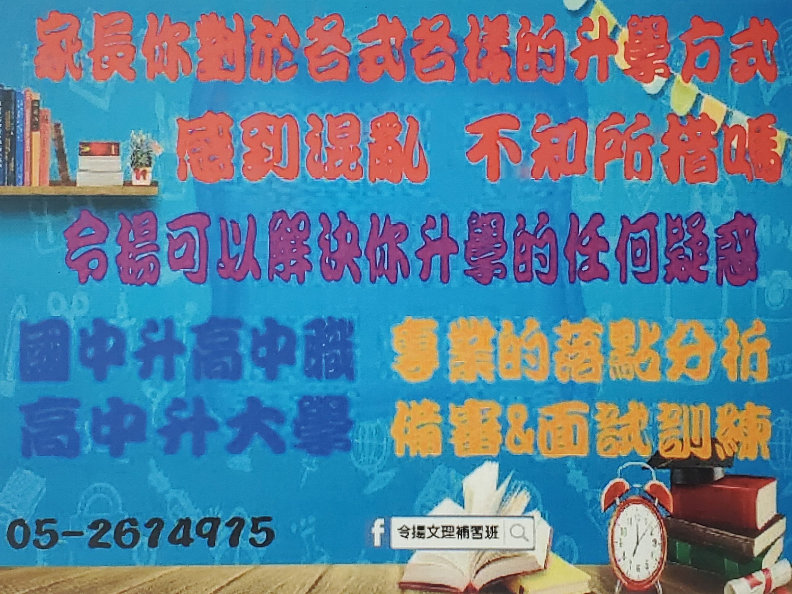 分享 教育機構 私立令揚文理短期補習班 2023 年 5 月 16 日上午 10:37 新增到我的最愛 電話/手機+88652614915 類別國中文理/安親班/兒童才藝班 區域/學校嘉義縣 地址嘉義縣竹崎鄉竹崎村中華路135號(1~2樓) 救國團桃園終身學習中心 114年11-12月救國團【藝文】終身學習中心課程 救國團中壢終身學習中心|寒假兒童課程 • 學習情報 • 🪂假日親子活動 2026桃園FUN寒假|活力小子冬令營 救國團藝文終身學習中心|寒假兒童課程-藝起FUN寒假 • 競賽專區 • 繪畫比賽 設計相關比賽 美術工藝比賽 我想了解更多 登入會員即可預約諮詢 展開表單 私立令揚文理短期補習班 評論 / 留言 共有0則留言 排序根據 最舊 最新 最舊 登入會員即可留言 送出