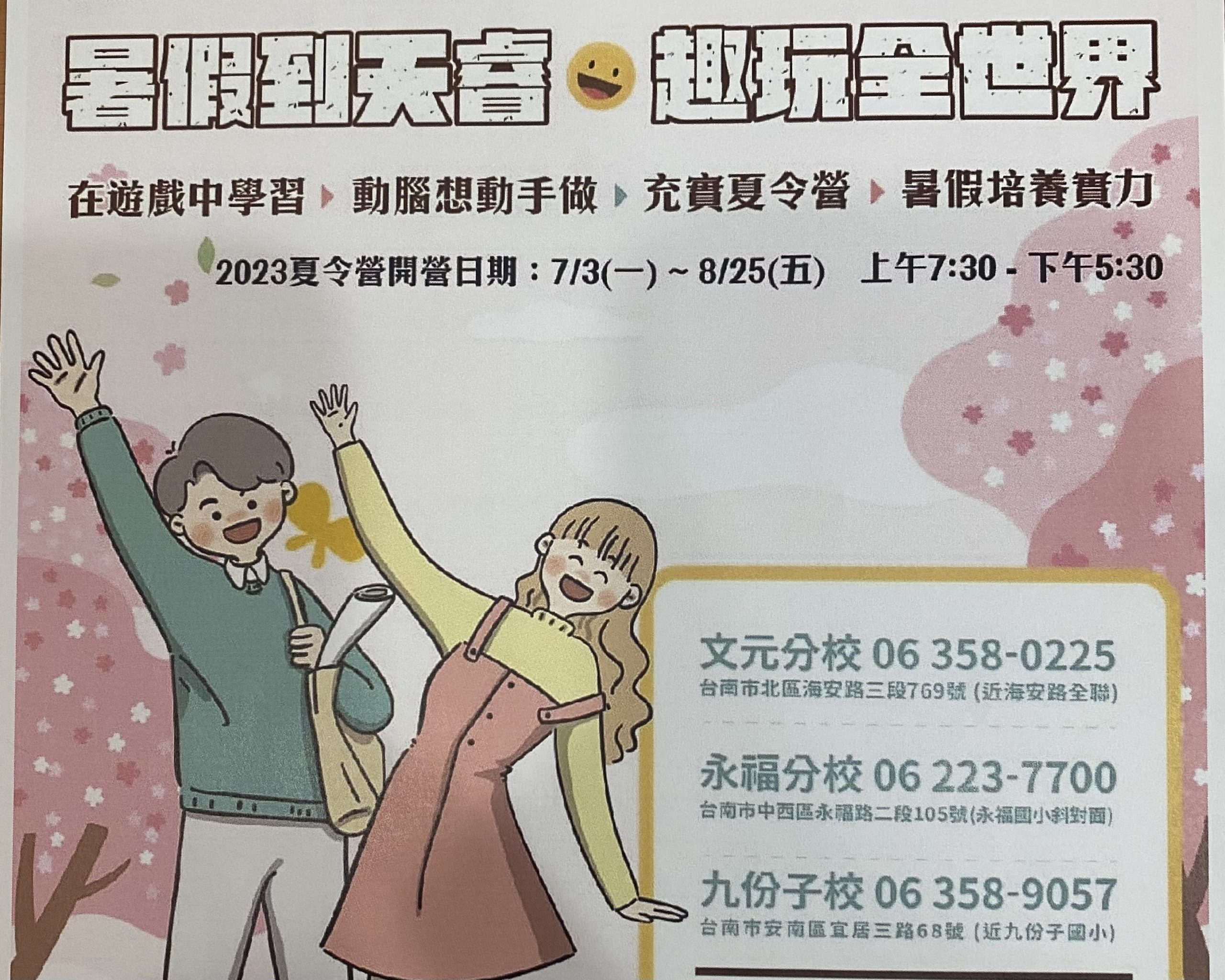 分享 教育機構 臺南市私立瑀睿文理技藝短期補習班 2023 年 5 月 16 日上午 11:17 新增到我的最愛 電話/手機+88663589057 類別國中文理/安親班/兒童才藝班 縣市/線上台南市 區域/學校安南區 地址安南區宜居三路68號1-2樓 救國團桃園終身學習中心 114年11-12月救國團【藝文】終身學習中心課程 救國團中壢終身學習中心|寒假兒童課程 • 學習情報 • 🪂假日親子活動 2026桃園FUN寒假|活力小子冬令營 救國團藝文終身學習中心|寒假兒童課程-藝起FUN寒假 • 競賽專區 • 繪畫比賽 設計相關比賽 美術工藝比賽 我想了解更多 登入會員即可預約諮詢 展開表單 臺南市私立瑀睿文理技藝短期補習班 評論 / 留言 共有0則留言 排序根據 最舊 最新 最舊 登入會員即可留言 送出
