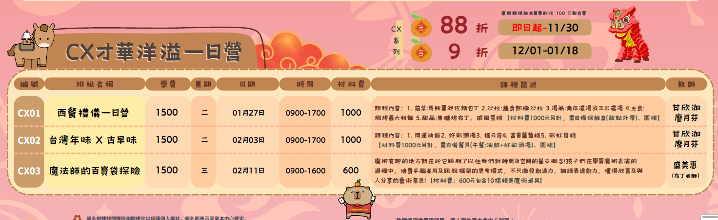 2. 全日營材料費皆另計,恕不折扣,請與學費一同繳交。