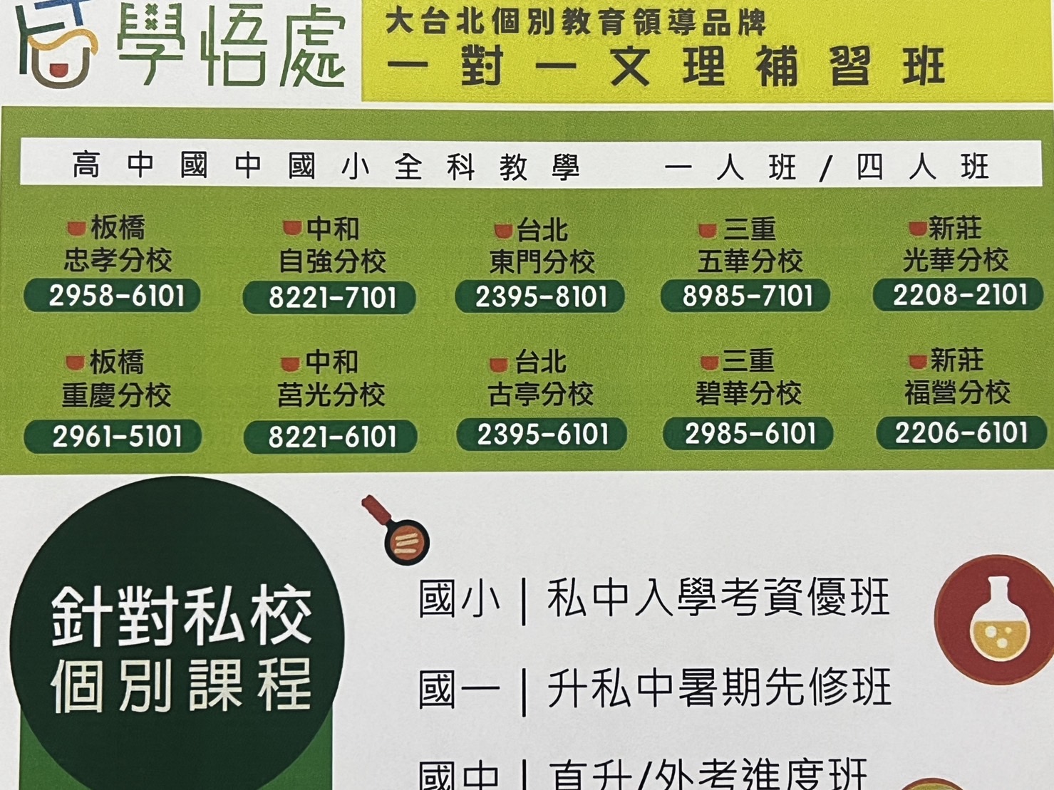 | 開課中班別 國中/高中考前衝刺班,國中國文班,國中數學班,國中社會班,國中自然(理化/生物/地球科學)班,國中英文班,國中課輔班 |